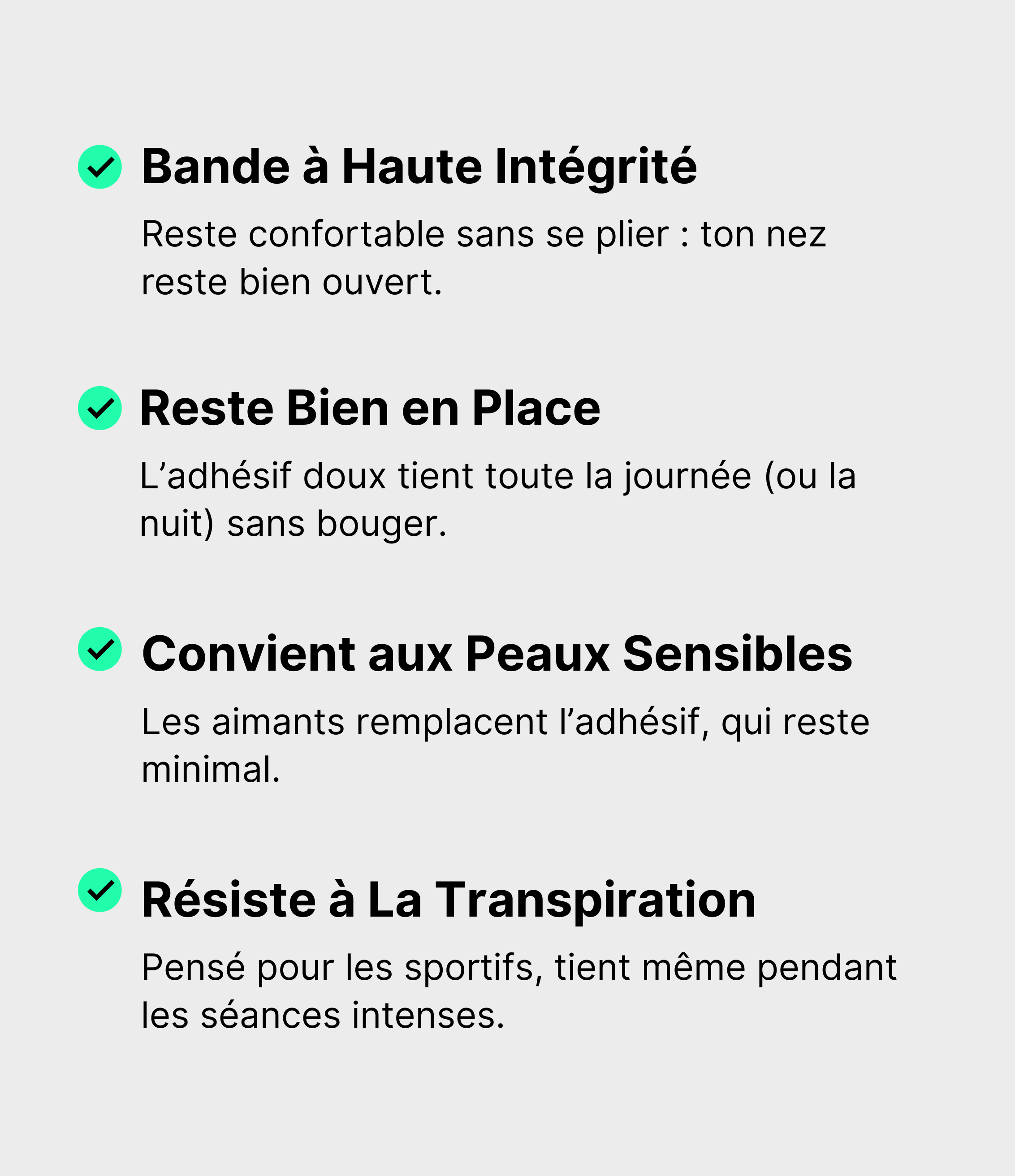 C’est un système biomagnétique breveté qui ouvre tes voies nasales comme jamais auparavant, pour t’aider à mieux dormir, mieux récupérer, mieux performer.